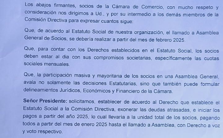 En contacto con tereré rupa, Santiago Benítez, socio de la Camara de Comercio de Ayolas, contó que en miras a las elecciones de nuevas autoridades a realizarse próximamente, se encuentran solicitando la exoneración de cuotas de los años 2019 al 2024, para comprometer a los socios a abonar solo las cuotas del año 2025, de manera que pueda darse una mayor participación de los socios que forman parte de la organización.